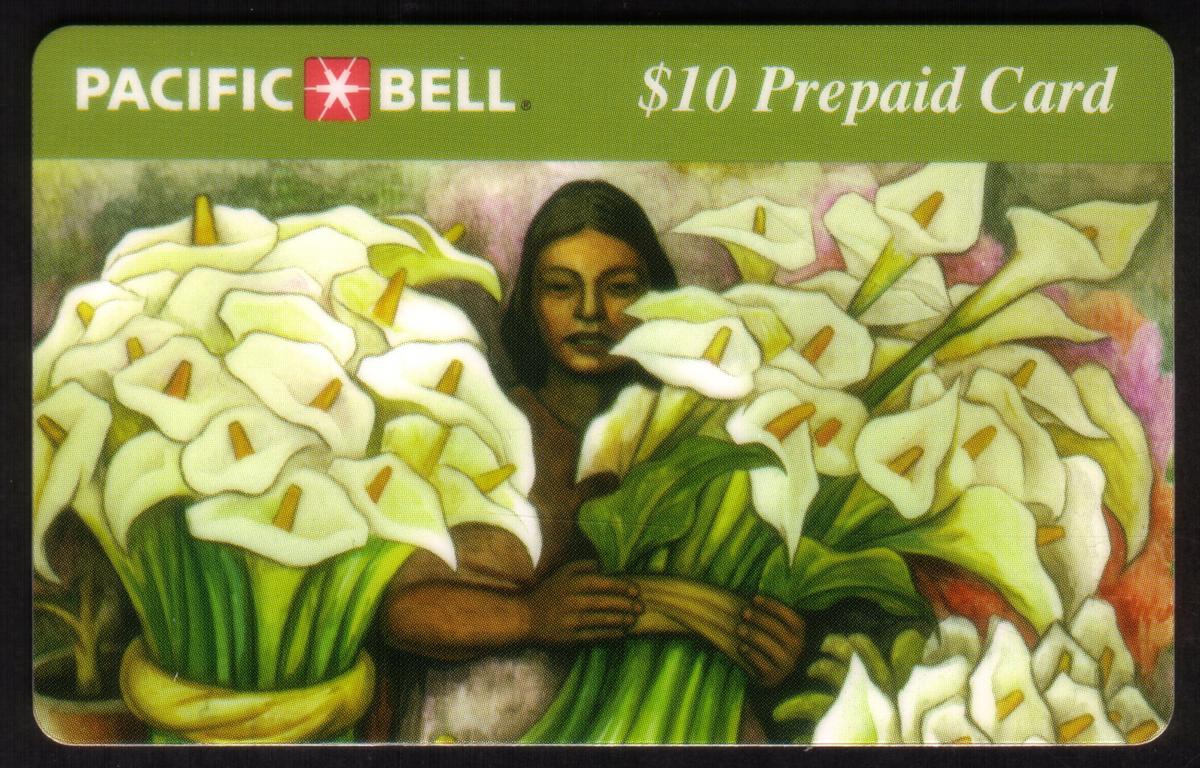 The card is issued by Pacific Bell and includes bilingual text in Spanish and English. The denominations presented on the card indicate a $10 value, reinforcing its use as a phone card. The design reflects a connection to holidays and family, highlighting the cultural importance of Mother's Day through the artistry of Diego Rivera’s flower vendor.