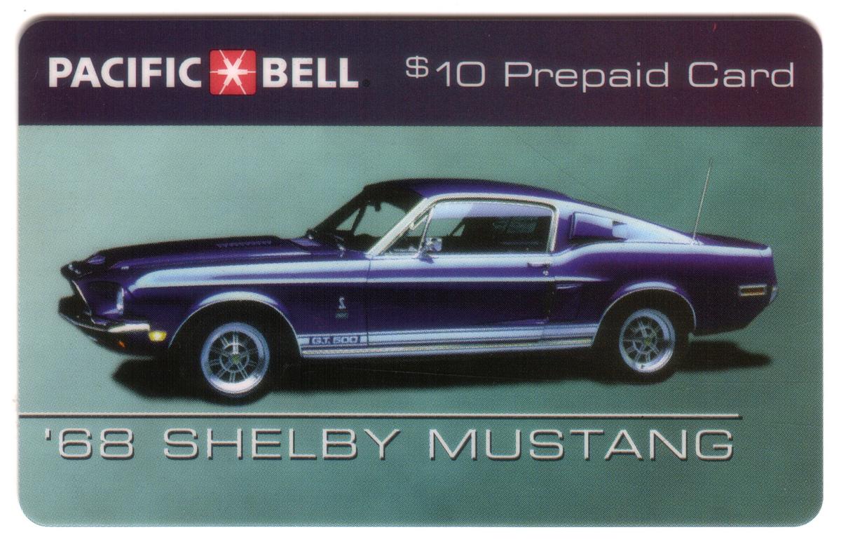 This collectible phone card features a vibrant image of a 1968 Ford Shelby Mustang, showcasing the iconic classic car in a striking pose. The car is shown with its distinctive white body and black racing stripes, emphasizing its legendary design and automotive heritage. The background captures a warm outdoor setting, highlighting the car as the focal point with clear attention to detail on its sleek curves and sporty elements.