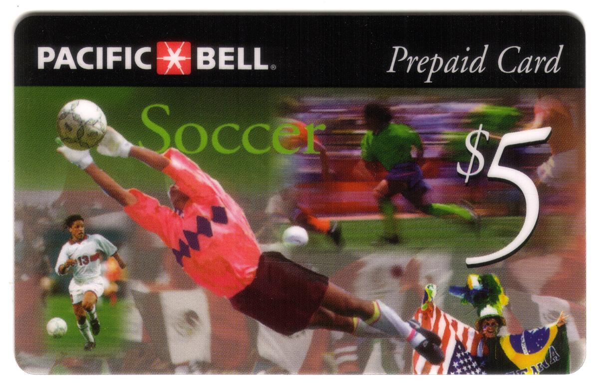 The overall design uses bright colors emphasizing the green of the field under daylight conditions. The card’s layout is clean, highlighting the soccer theme clearly. The imagery and markings confirm it is associated with the sport of soccer (futbol) and is produced by Pacific Bell, offering a $5 value.