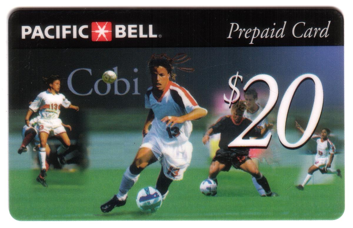 This card is issued by Pacific Bell, as indicated by the logo present on its surface. It is identified as a SPECIMEN with the code G420. It showcases official symbols and text related to the sport of soccer without additional imagery beyond the featured players and sponsor branding.