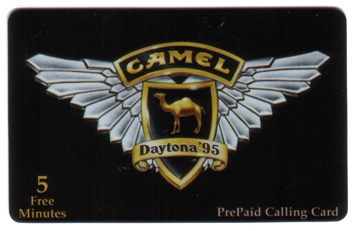 In the lower left corner, the card indicates it provides "5 Free Minutes" of prepaid calling time. The lower right corner has the text "PrePaid Calling Card" printed in a fine, gold-colored font. The card’s clean, bold design strongly associates it with the Camel cigarette brand and the Daytona '95 racing sponsorship.