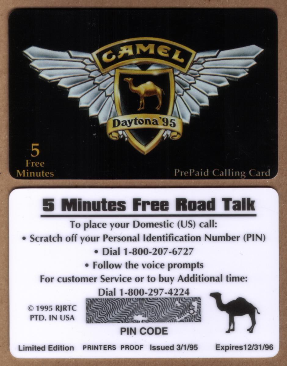 This card is linked to RJ Reynolds Tobacco Company (RJRTC) and the advertising campaign featuring Smokin' Joe Camel, as evidenced by the keywords and visual elements. It serves both as a collectible item and a functional prepaid calling card, connected to the 1995 Daytona racing finish line theme.