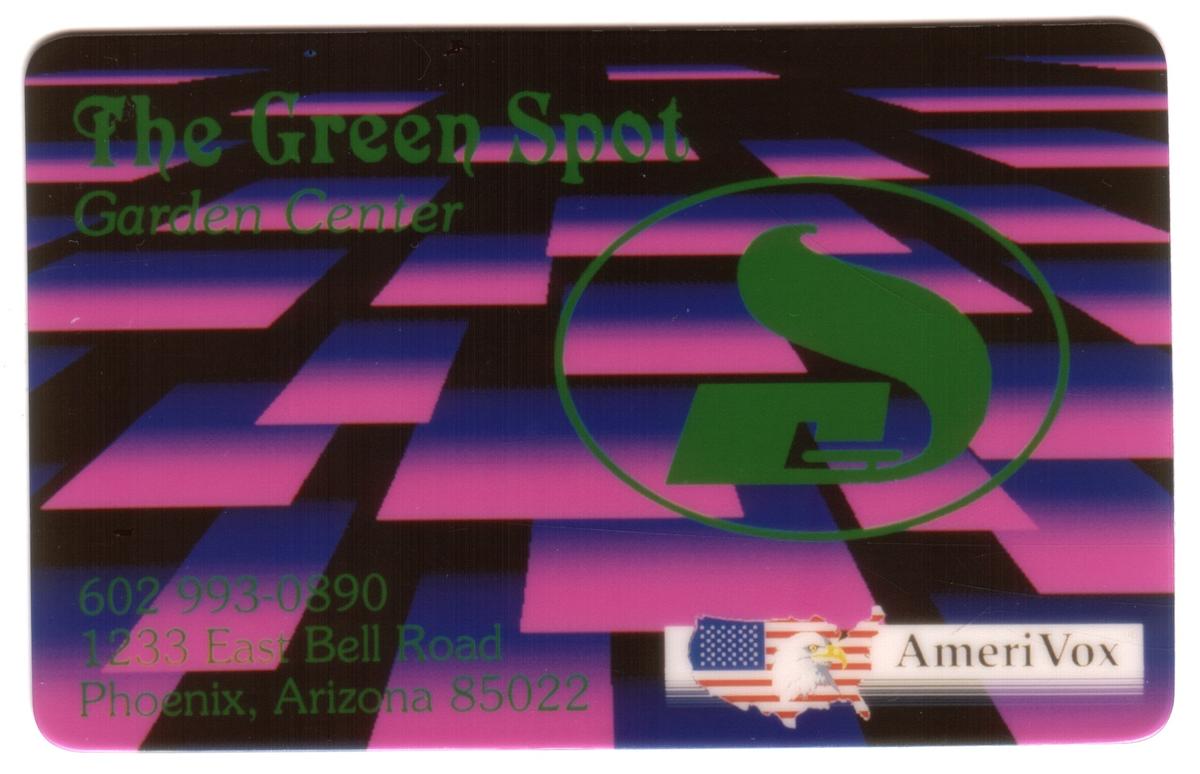 This collectible chip card features the corporate logo and branding of The Green Spot Garden Center, located in Phoenix, Arizona. The front of the card prominently displays the official name "The Green Spot Garden Center" alongside a green and white color scheme that reflects the garden center’s identity. The design includes a simple yet clear layout with "Phoenix Arizona" printed to indicate its location. The card also carries the word "PROOF" and the name AmeriVox in the lower portion, identifying the issuer or associated service provider.
