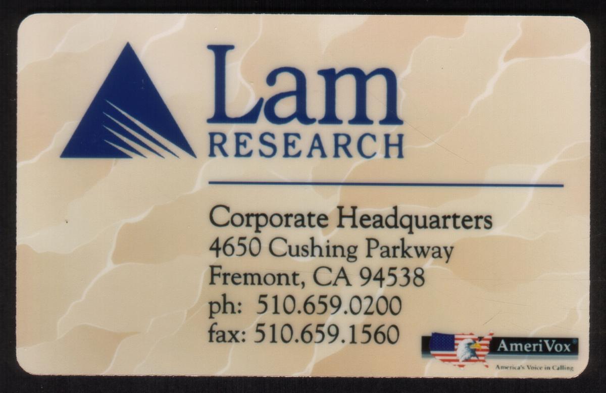 This collectible corporate business card features the logo and trademark of Lam Research, a company specializing in semiconductor manufacturing and computing devices. The card prominently displays the Lam Research Corporate Headquarters located in Fremont, California. The design includes the Lam Research name in clear, bold letters, paired with a modern and clean corporate logo that reflects the company’s focus in technology and innovation.