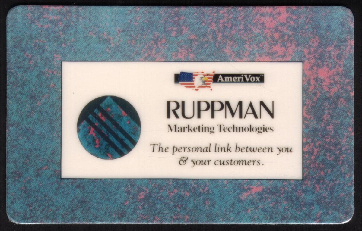 This collectible phone card features a prominent logo of Hinduja Group Ruppman Marketing Technologies based in Peoria, Illinois. The card includes the word “PROOF” alongside the AmeriVox name, indicating an association with these entities. The imagery and design focus on business process management services along with advertising, marketing, and public relations themes tied to the Hinduja Group.