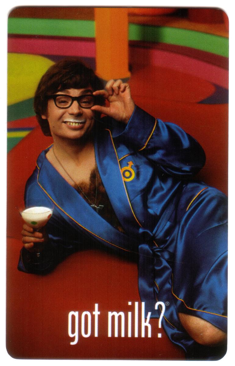 Overall, the card is a collectible telecom phone card issued as part of the promotional campaign combining the 1999 movie "The Spy Who Shagged Me" and the "Got Milk?" advertising featuring Austin Powers, created by New Line Productions Inc and sanctioned by the National Fluid Milk Processor Promotion Board.