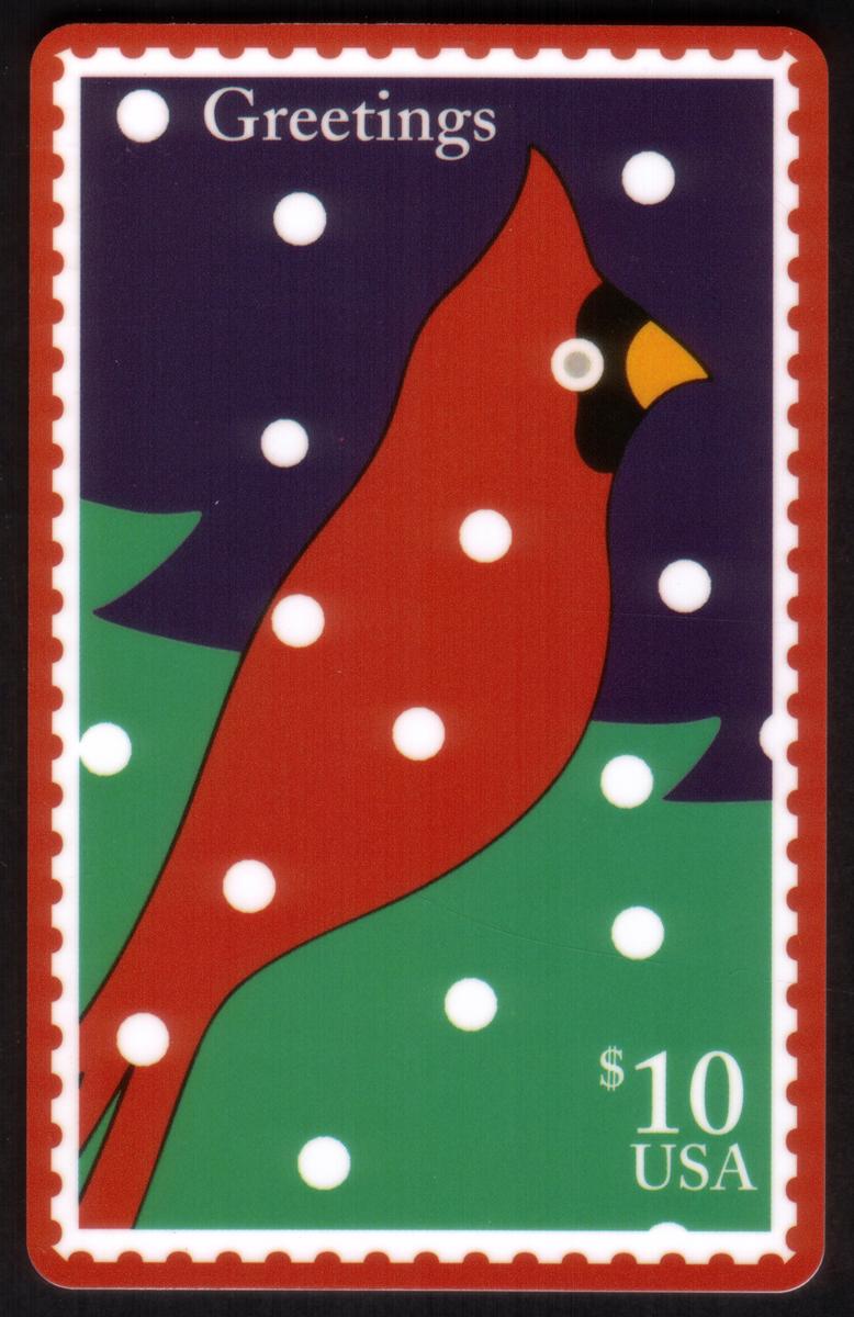The card combines elements of artistic design with functionality as a prepaid phone card. It highlights birds within the theme of holidays and snow at Christmas by featuring the cardinal, a bird often associated with festive imagery. The overall presentation is clean and focused on the winter greeting and philatelic artistry, as issued by USPS and supported by Amex Telecom for phone use.