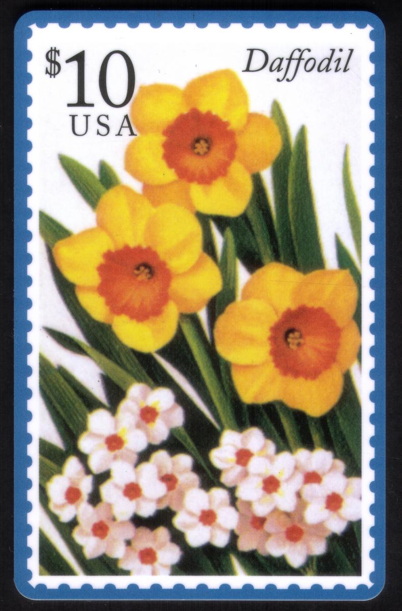 Overall, this collectible phone card combines floral artwork with postal and telecom branding, representing both botanical beauty and functional phone card use within the United States. The imagery and logos on the card confirm its association with the USPS Daffodil Flowers issue and Amex Telecom.
