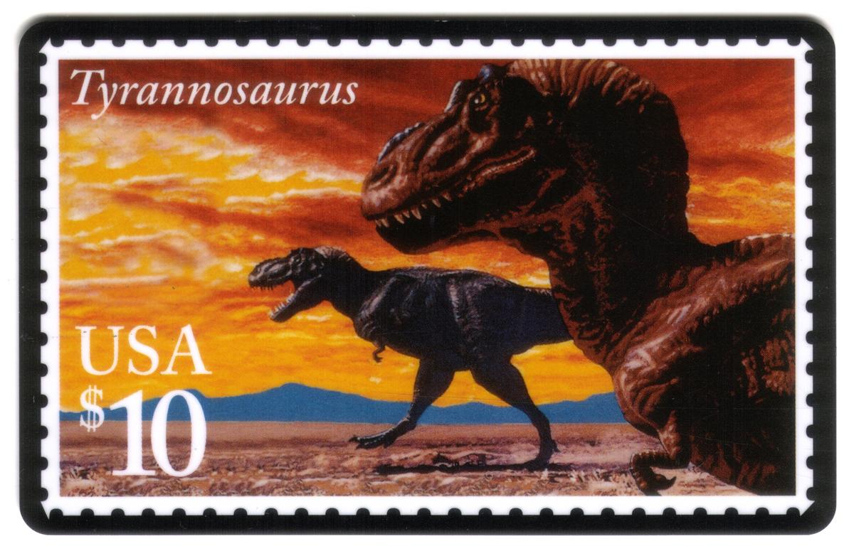 The background of the card uses shades of green and brown to complement the dinosaur, suggesting a prehistoric, forested environment. At the bottom right, the words “Tyrannosaurus Dinosaurs,” “US Postal Service Issue,” and “USPS” are printed, connecting this phone card visually and thematically to the official philatelic release. The overall composition integrates the concept of stamp collecting and philately, reflected in the careful presentation of the dinosaur as both a collectible image and a practical $10 phonecard.