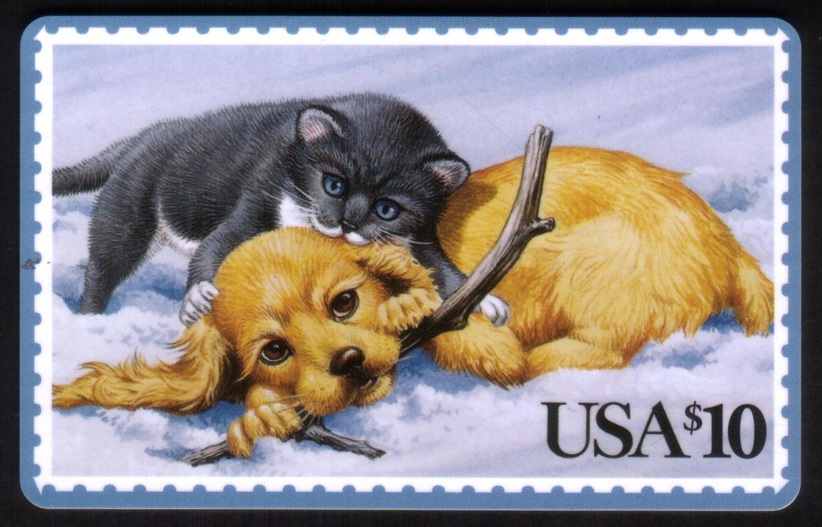 This collectible phone card features artwork from the United States Postal Service titled "Puppy & Kitten Playing In The Snow." The image showcases a brown dog holding a stick in its mouth alongside a group of kittens playing in the snow. The animals are depicted in a natural and playful winter scene characterized by snow-covered ground. The artwork emphasizes a warm, friendly interaction among the animals, highlighting the dog and kittens in a snowy environment.