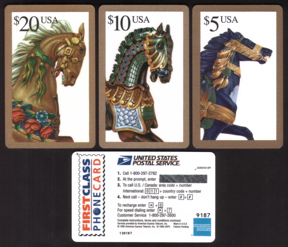 Each card clearly states its value in large print at the top left corner – $5 USA, $10 USA, and $20 USA – identifying their denominations. These cards are from the Carousel Horses series, issued by USPS and distributed by Amex Telecom. They highlight the artistry and festive spirit of carousel horses tied to the Christmas holiday theme.
