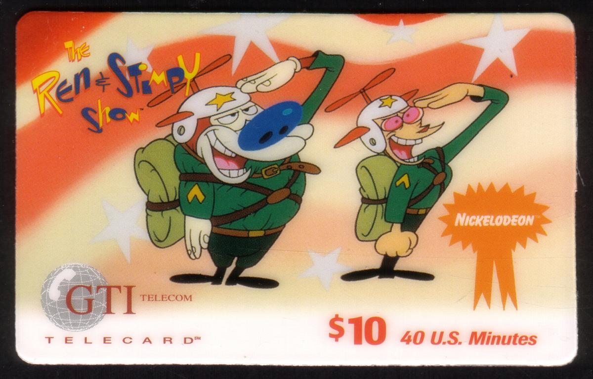 Overall, this collectible merges military imagery with iconic cartoon characters in a unique, visually engaging way. The detailed drawings reflect the artistic style of *Ren & Stimpy* and highlight its animation and humor through the use of a propeller hat and salute pose on Ren. The $10 value and branding indicate that it is a usable phone card issued by GTI Telecom, Inc.