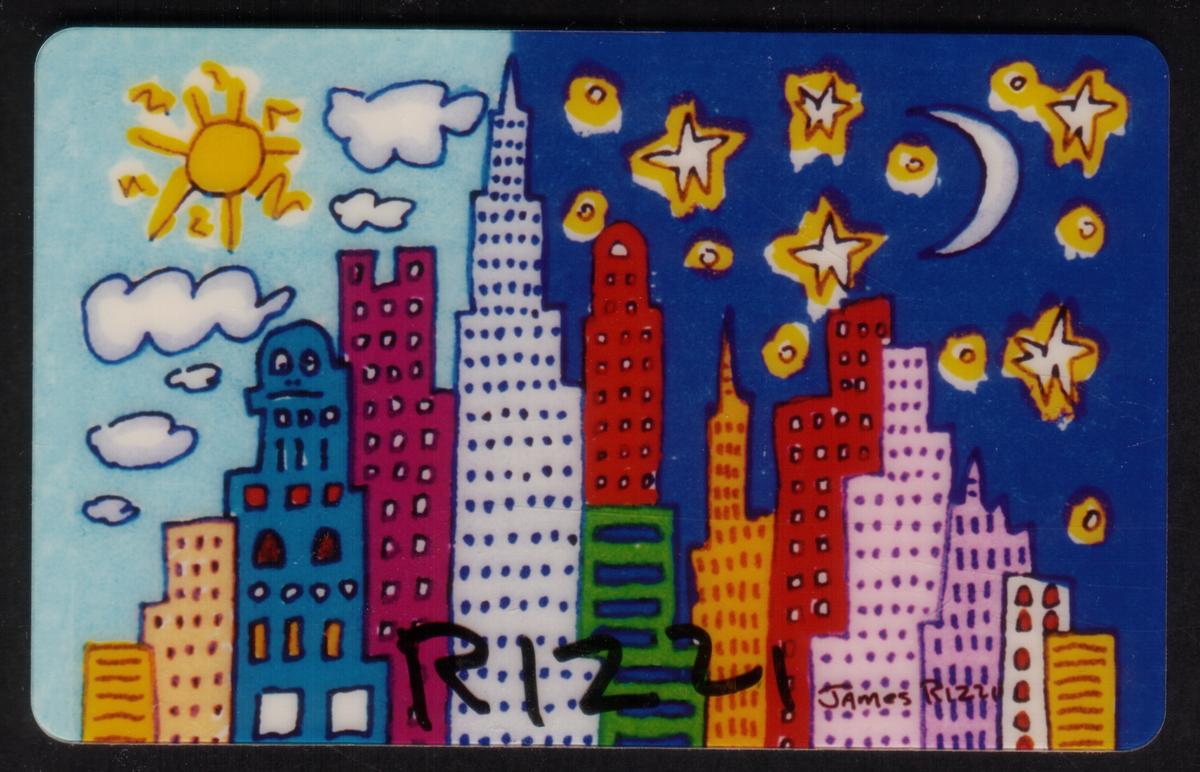 The word "Rizzi" is prominently written in black across the lower-center part of the card, verifying the artist’s signature style, while "James Rizzi" is also printed in smaller text near the lower-right side of the image. This artwork blends elements of contemporary and whimsical art, aligning with themes common in James Rizzi's work, whose colorful and playful aesthetic captures the energy and vibrancy of New York City.