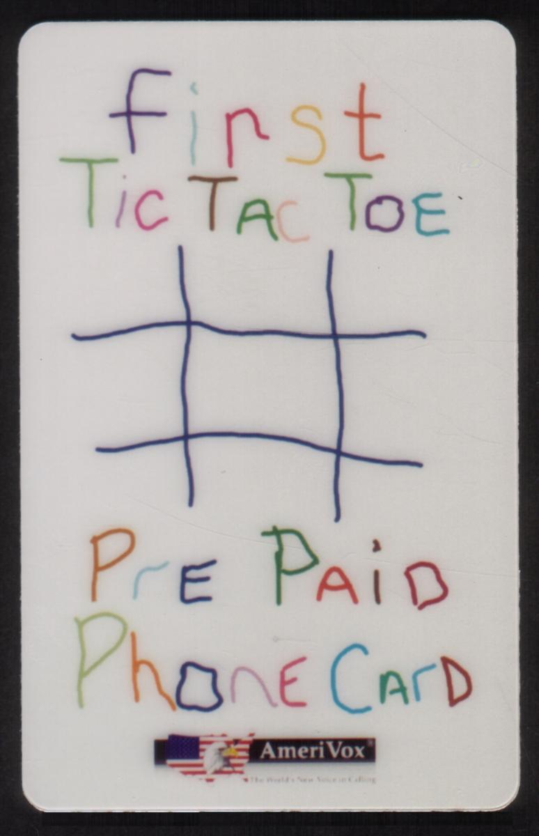 This card is connected to the theme of games and children’s artistic imagery and is the first Tic Tac Toe phone card issued by AmeriVox. The design combines promotional elements with a simple game motif, making it both a functional prepaid phone card and a collectible item.
