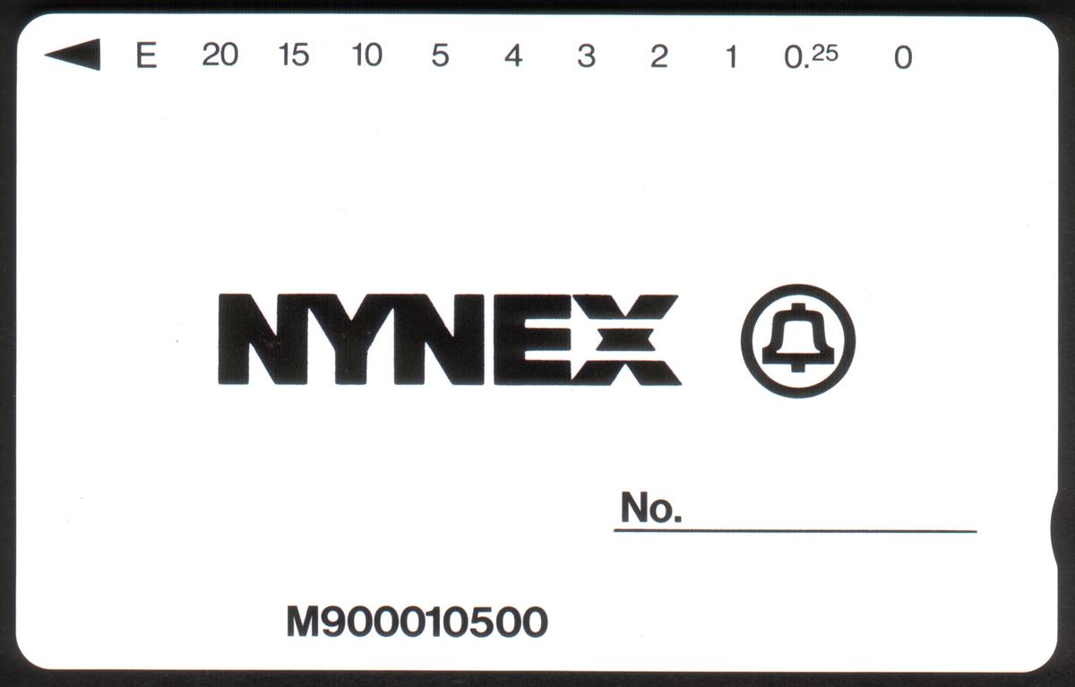 This set contains five Labo Test Cards issued for New York Telephone, branded with NYNEX and the Bell logo. The cards are designed for use as maintenance or test cards for yellow telephones. Each card is clearly marked with the monetary value it represents: $1, $5, $10, and two $20 cards.