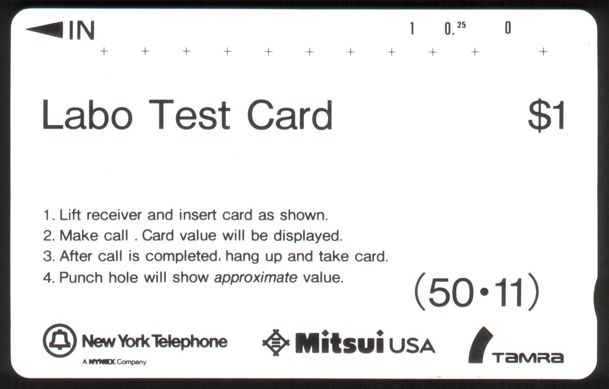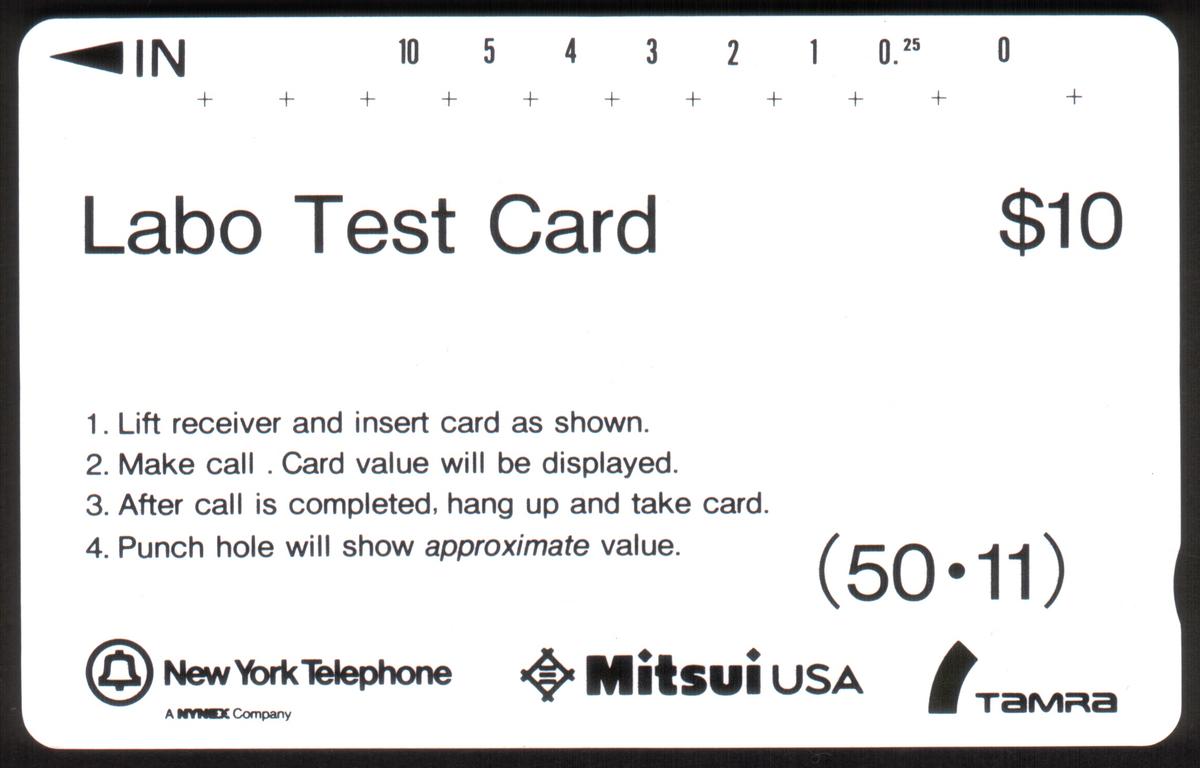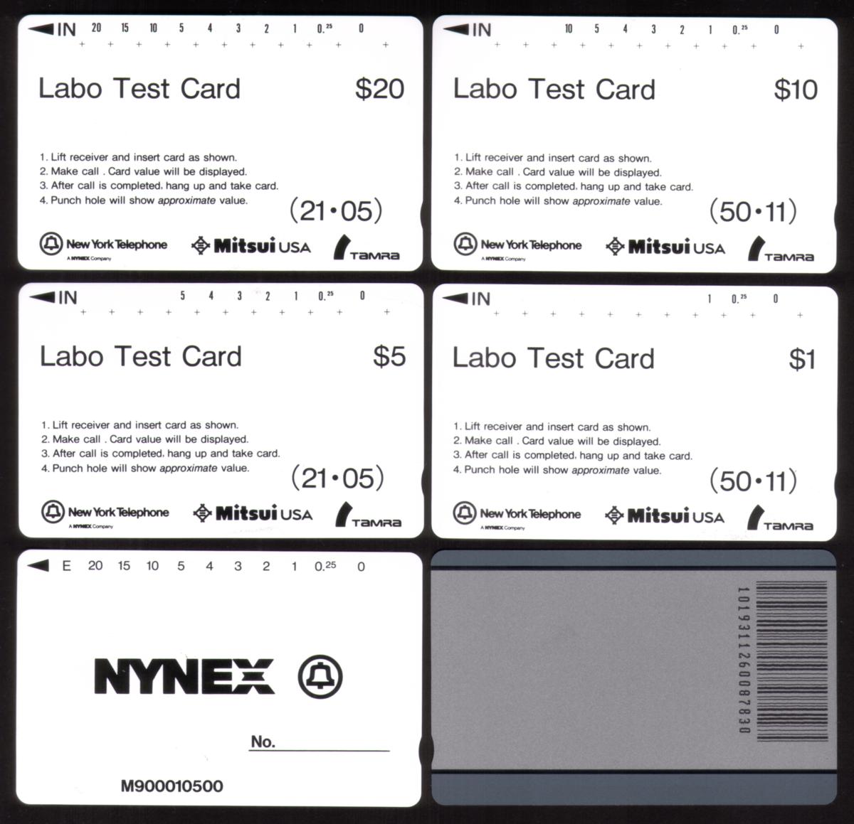 The set’s layout includes a numeric scale along the top edge of each card, with increments and indicators to assist in card insertion and usage. The text "Labo Test Card" is prominently displayed near the center left of each card, alongside the dollar amount printed on the right. The cards serve a functional role in telephone maintenance and testing, specifically within the New York Tel. network under NYNEX management.
