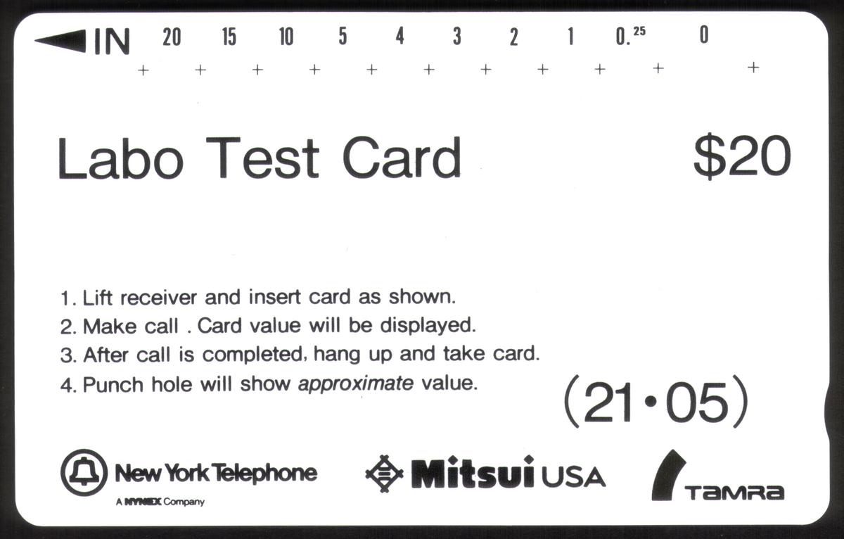 The cards feature simple, clean designs with instructions printed in black text on a white background. The instructions guide users to lift the receiver, insert the card, make a call, and then hang up to retrieve the card, noting that a punch hole will show the approximate value after use. Logo marks on the cards include New York Telephone, Mitsui USA, and Tamra, indicating the involvement of these companies in the card production and distribution.