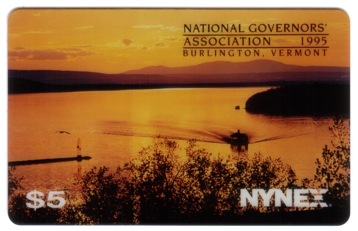 Vermont scenic landscape with lake, boat, trees, and mountains; features National Governors'' Association 1995 Burlington, VT, logo, $5 value, NYNEX branding. |