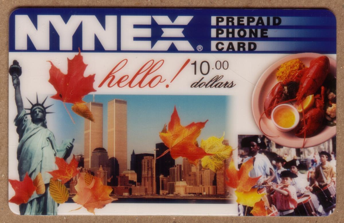 New York City skyline with Twin Towers, Statue of Liberty, maple leaves, seafood dish, children playing music, blue NYNEX logo, $10 prepaid phone card. |