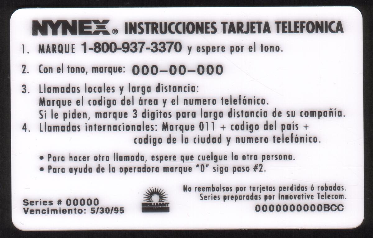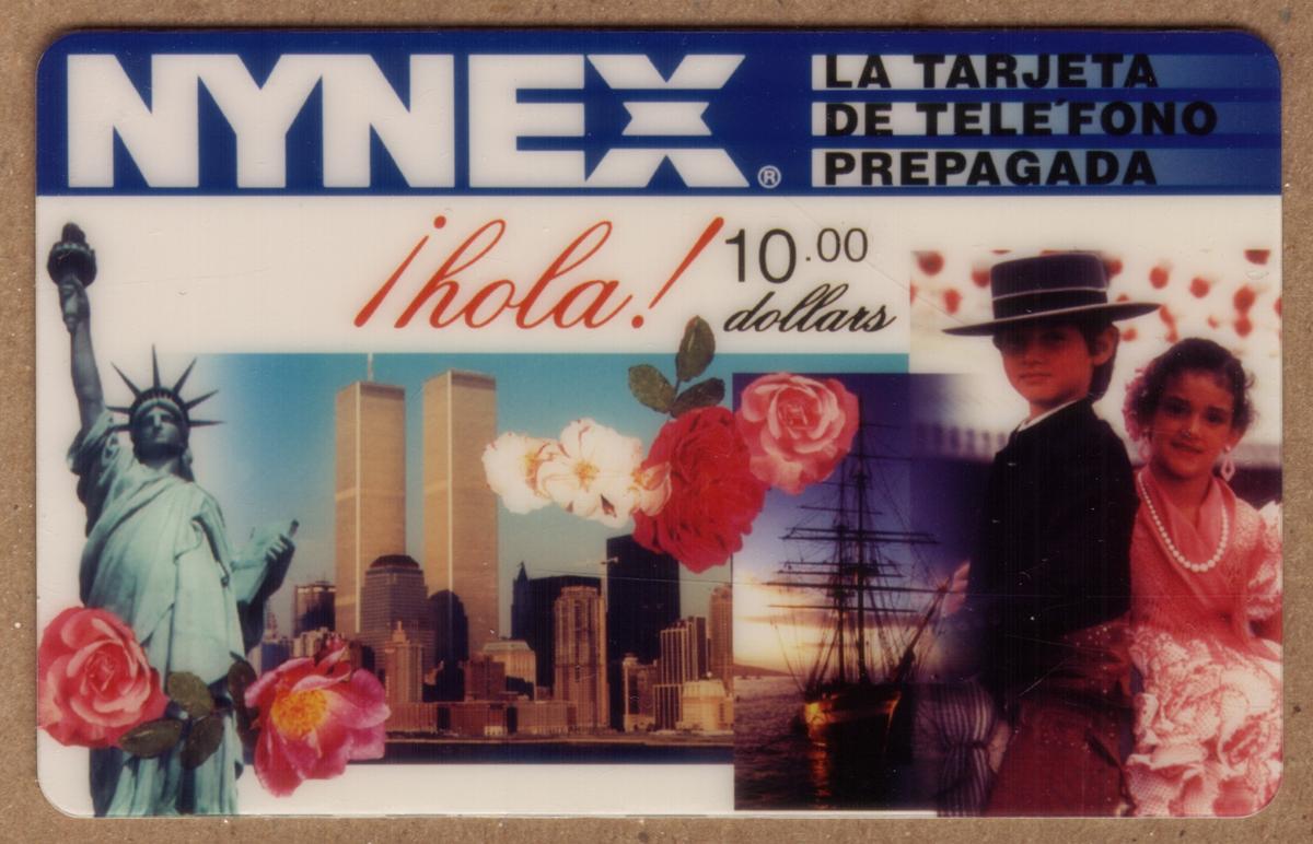 NYNEX prepaid phone card featuring Statue of Liberty, Twin Towers, vintage children, floral accents, maritime scene, and bilingual instructions for US and Hispanic users. |