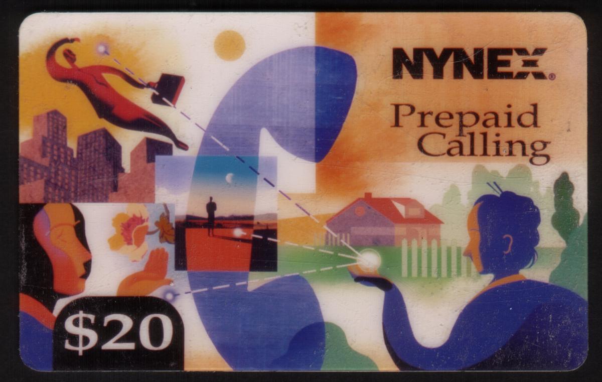 The right side of the card shows a rural house with a red roof and a white picket fence in the background, along with a blue silhouette of a person holding a glowing, palm-sized light orb. The denomination "$20" is displayed in white text within a black rounded rectangle on the bottom left corner. The upper right corner contains the “NYNEX” brand name in black, accompanied by the text “Prepaid Calling” beneath it.