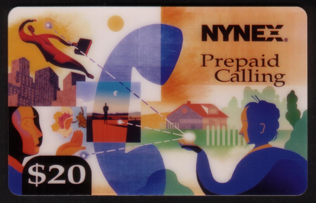 This collectible prepaid calling card from NYNEX, dated 1995, has a $20 white denomination displayed in the lower left corner. The design features abstract and symbolic artwork representing communication and connection. On the right side, a silhouetted blue figure extends an open hand holding a glowing white orb, symbolizing a point of connection or communication.