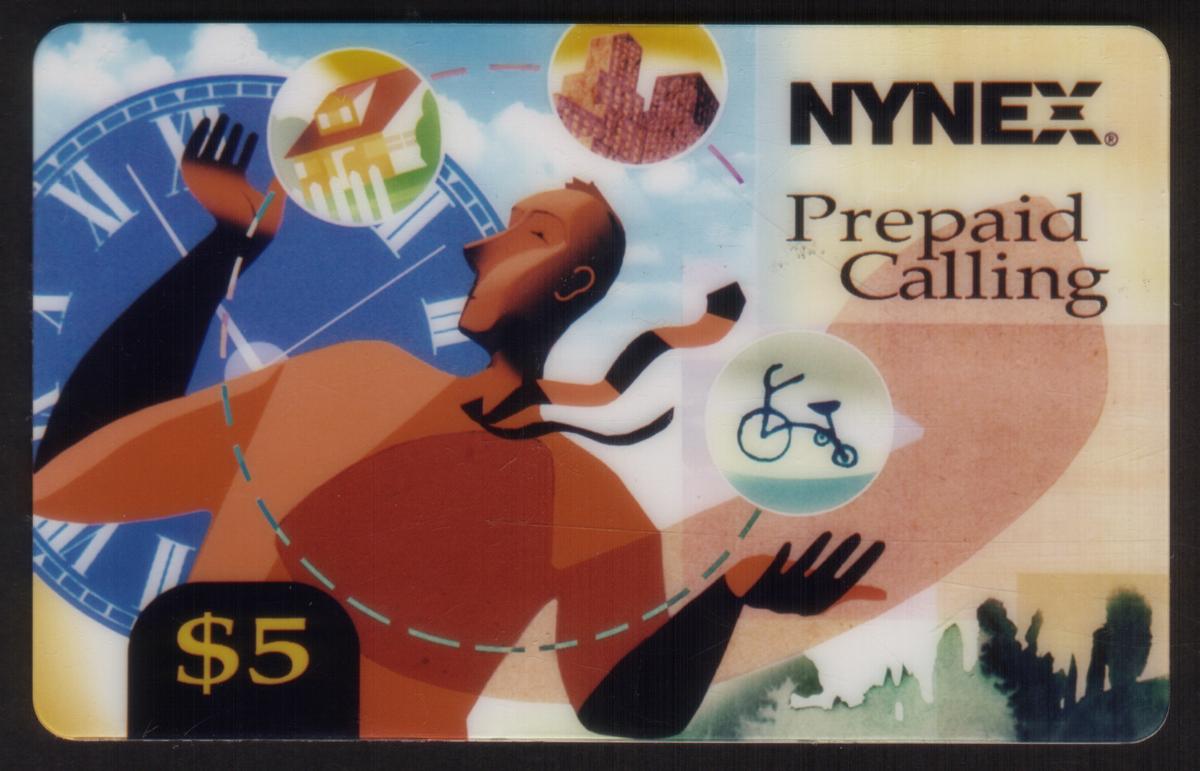 Stylized geometric man with clock, cityscape, courthouse, and bicycle symbols; $5 value; NYNEX Prepaid Calling logo; artistic and functional design. |