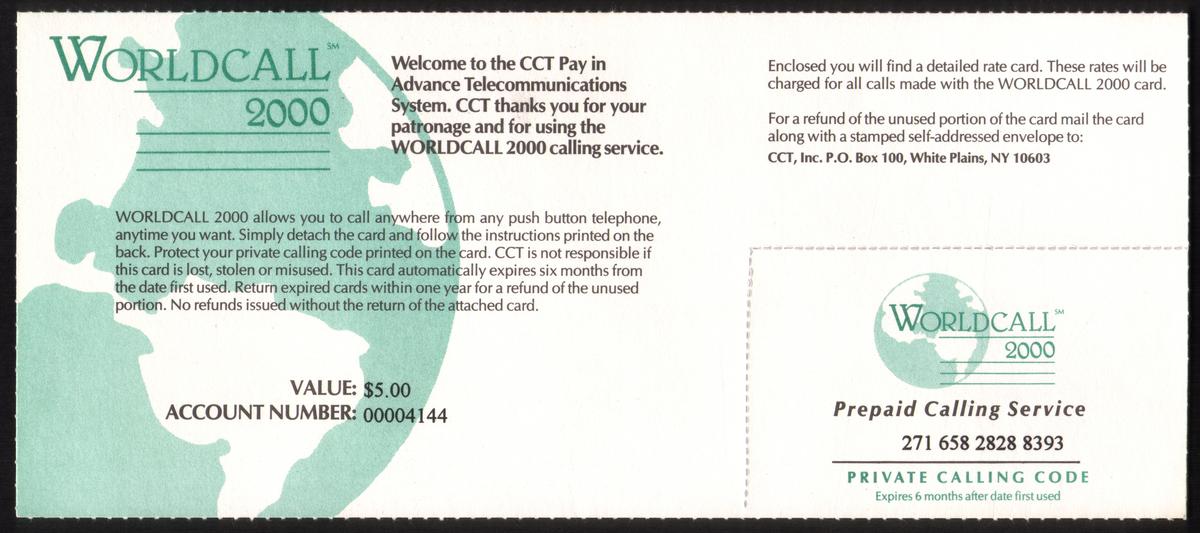 This card is a WorldCall 2000 prepaid calling service card issued by CCT (Computerized Calling Technologies) for use with the CCT Pay in Advance telecommunications system. The card provides a prepaid calling value of $5.00, clearly printed on the front along with an account number, 00004144. The WorldCall 2000 logo is prominently displayed in green with a subtle globe graphic in the background.