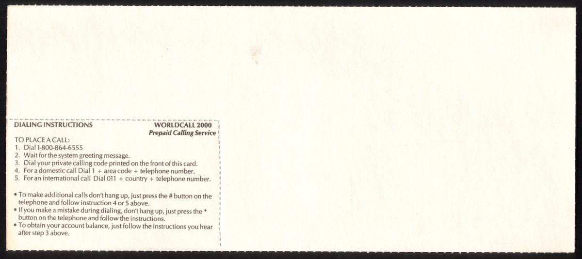 Additional details include a private calling code printed on the card for authorization. The card is clearly marked as a prepaid calling card for telecommunications, specifically utilizing WorldCall 2000 services for pay-in-advance calls. Phone numbers and codes related to the service are listed, alongside clear legal and usage instructions.
