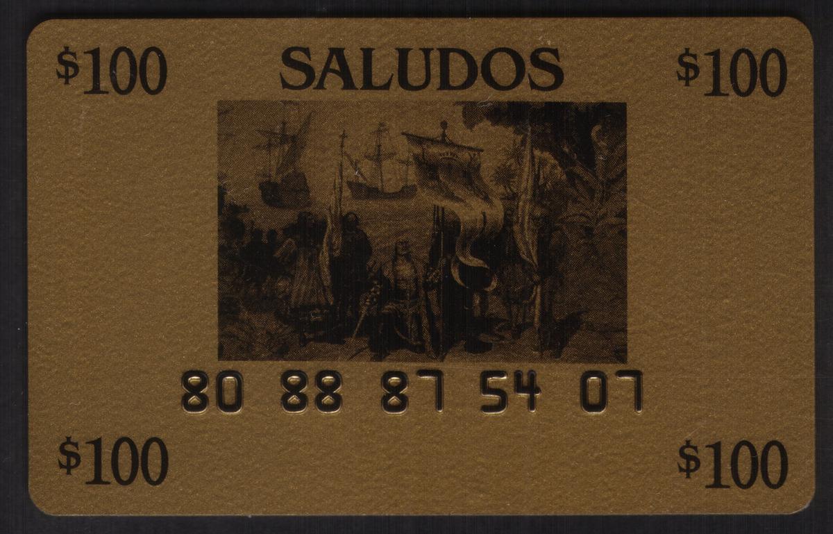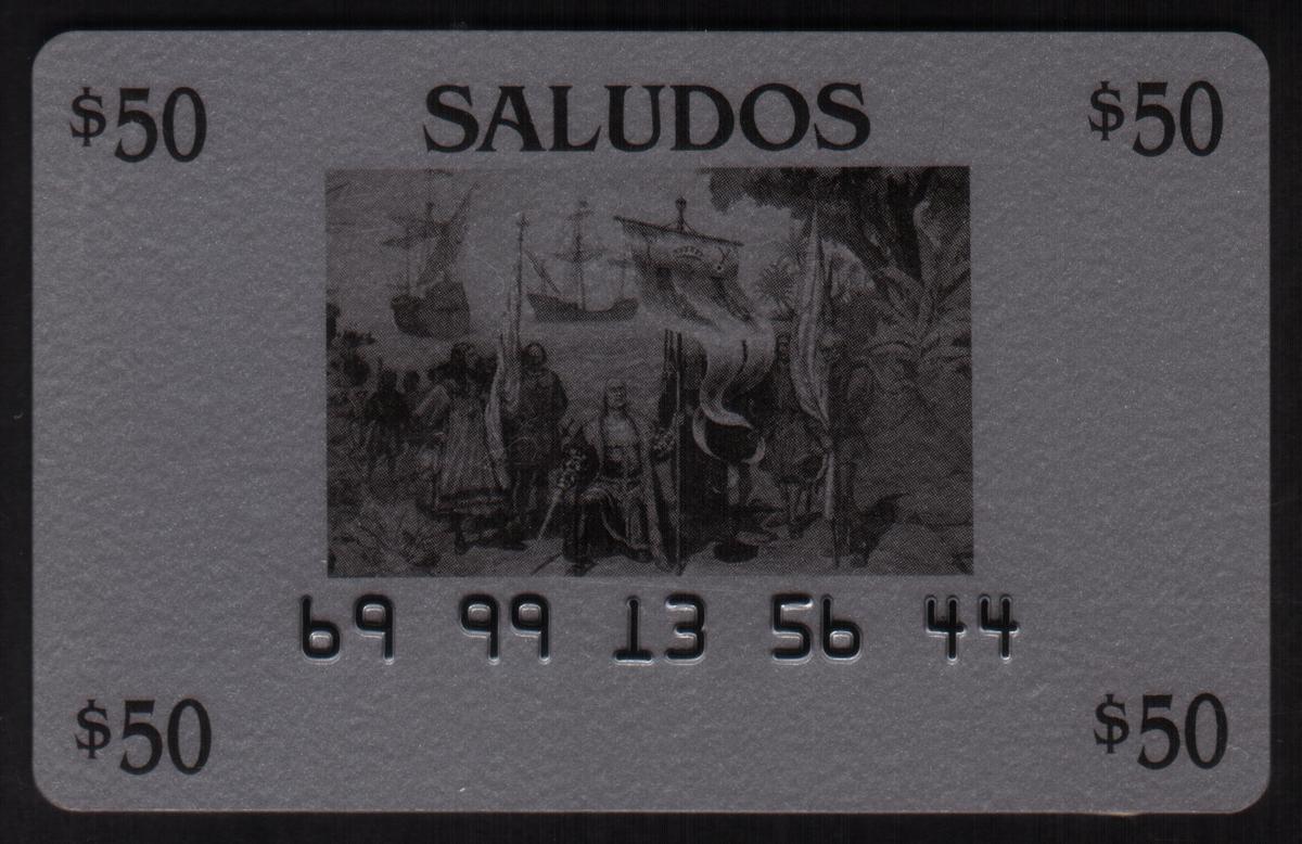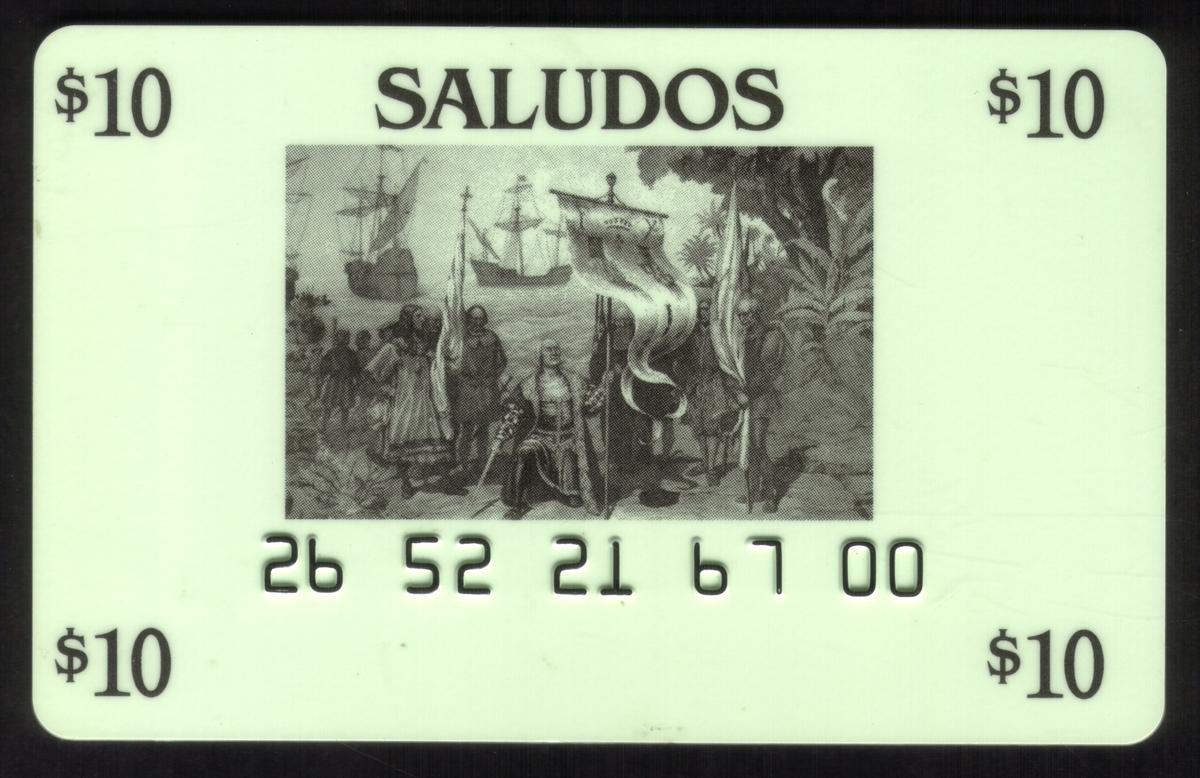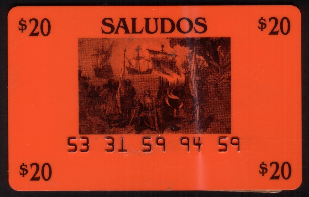 This set of five collectible user cards features prominent historical references related to Christopher Columbus and his voyages to the Americas. The cards display the names "Nina," "Pinta," and "Santa Maria," which are the three ships used by Columbus during his 1492 expedition. One of the cards is embossed with the phrase "First Cards: Columbus Landing In The Americas & 3 Ships," emphasizing the theme of the set. The collection is titled "Saludos," which appears prominently on one of the cards.