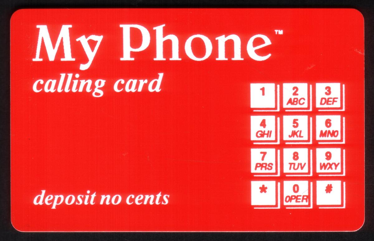 This is a red "My Phone" calling card produced by Price Communications. The card’s front design prominently features the white text "My Phone™ calling card" in the upper left area. Beneath the main title, the phrase "deposit no cents" is printed in lowercase white letters.