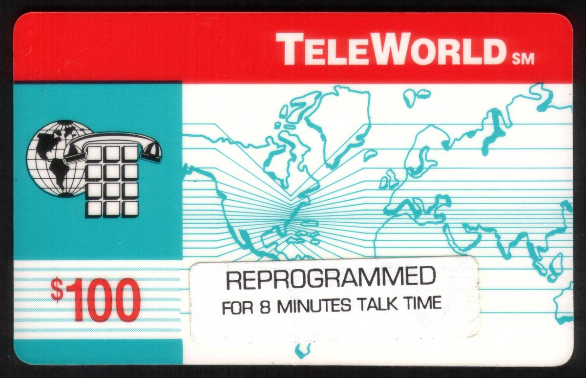 Vintage TELEWORLD prepaid calling card with a red and teal design, featuring global map, $100 value, and reprogrammed for 8 minutes talk time, used for international calls. |