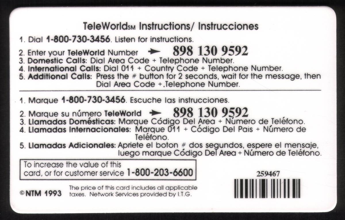 Keywords: generic user card, phones on phone cards, telephones on phonecards, world map, world globe, earth globe, earth map, dialing pad, reprogrammed for 8 minutes, teleworld provisional, itg, ntm 1993, map, Teleworld Internat'l.