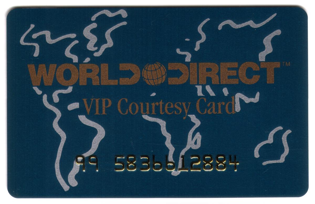 A 1993 VIP Courtesy Card from World Direct featuring a dark green background, silver world map, and gold accents, with embossed PIN and globe icon. |