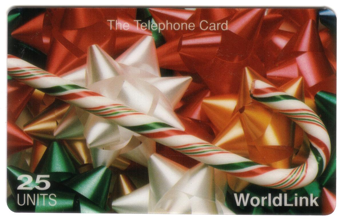 The card is branded with the WorldLink Communications logo, a notable feature located prominently on the card. The design emphasizes holiday celebration through its use of classic Christmas symbols and colors, making it visually appealing for collectors interested in seasonal themes.