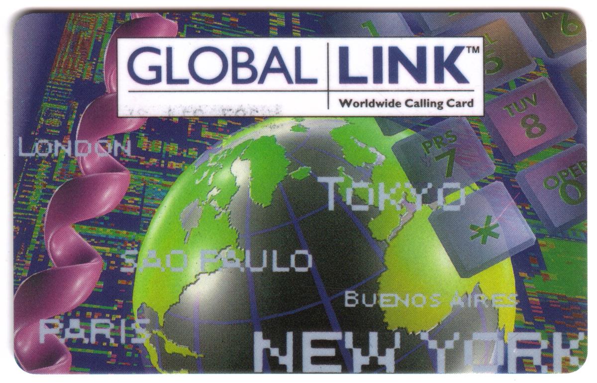 Global Link international calling card featuring a stylized globe, city names, digital patterns, and a pink telephone cord, symbolizing global telecommunication. |