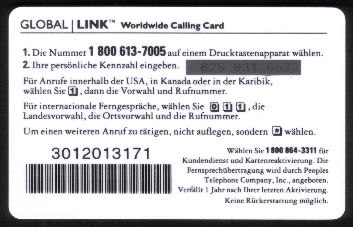 | Global Link: Globe, Cord, Cities. With Operator Button. German |