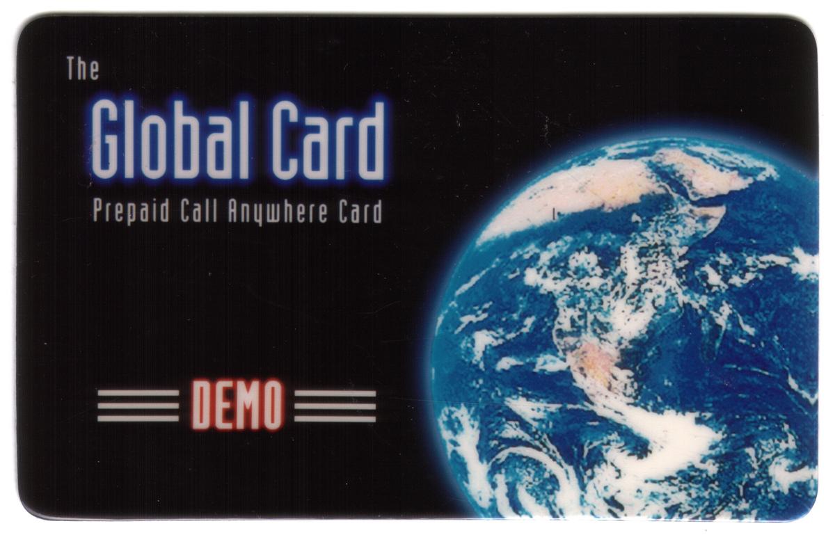 This collectible phone card features a photograph of Earth taken from outer space, showing the planet’s blue and white cloud-covered surface set against the deep blackness of space. The image captures the globe with visible landmasses and oceanic expanses, reflecting satellite photography. The card is issued by Global Tel. Solutions and prominently displays the text "Global Card" and "DEMO" on its front side, emphasizing its association with global telecommunications.