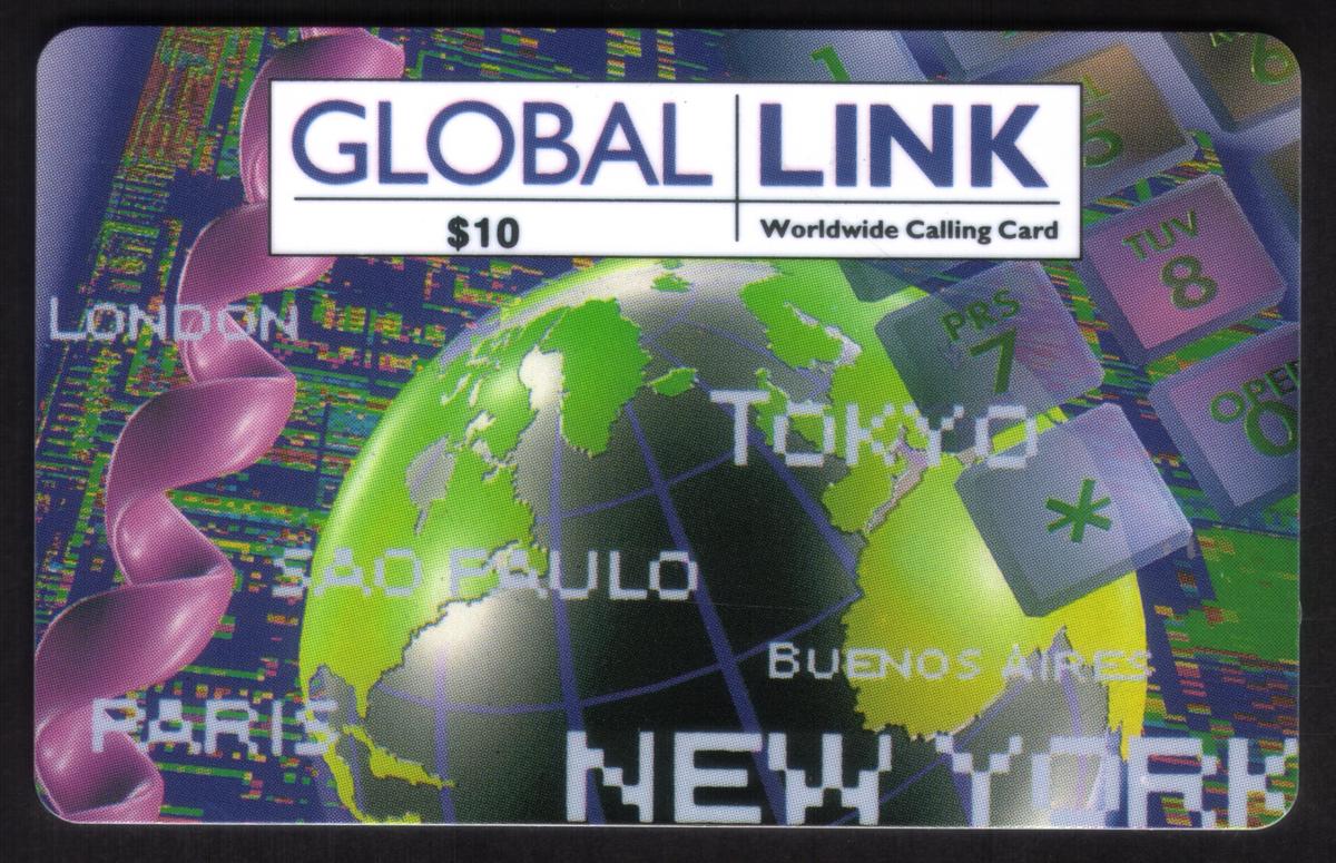 Global Link $10 international calling card featuring Earth, global cities, telephone motifs, and a nostalgic pink cord, symbolizing worldwide telecommunication. |