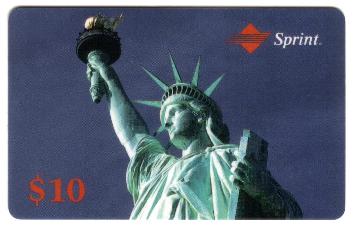 The card includes a printed value of "$10" in orange at the bottom left corner. In the upper right corner, the logo and name "Sprint" are displayed in white text with an accompanying red-orange diamond-shaped emblem. The overall design emphasizes the American historical landmark, the Statue of Liberty, symbolizing freedom and national heritage in New York City, New York.