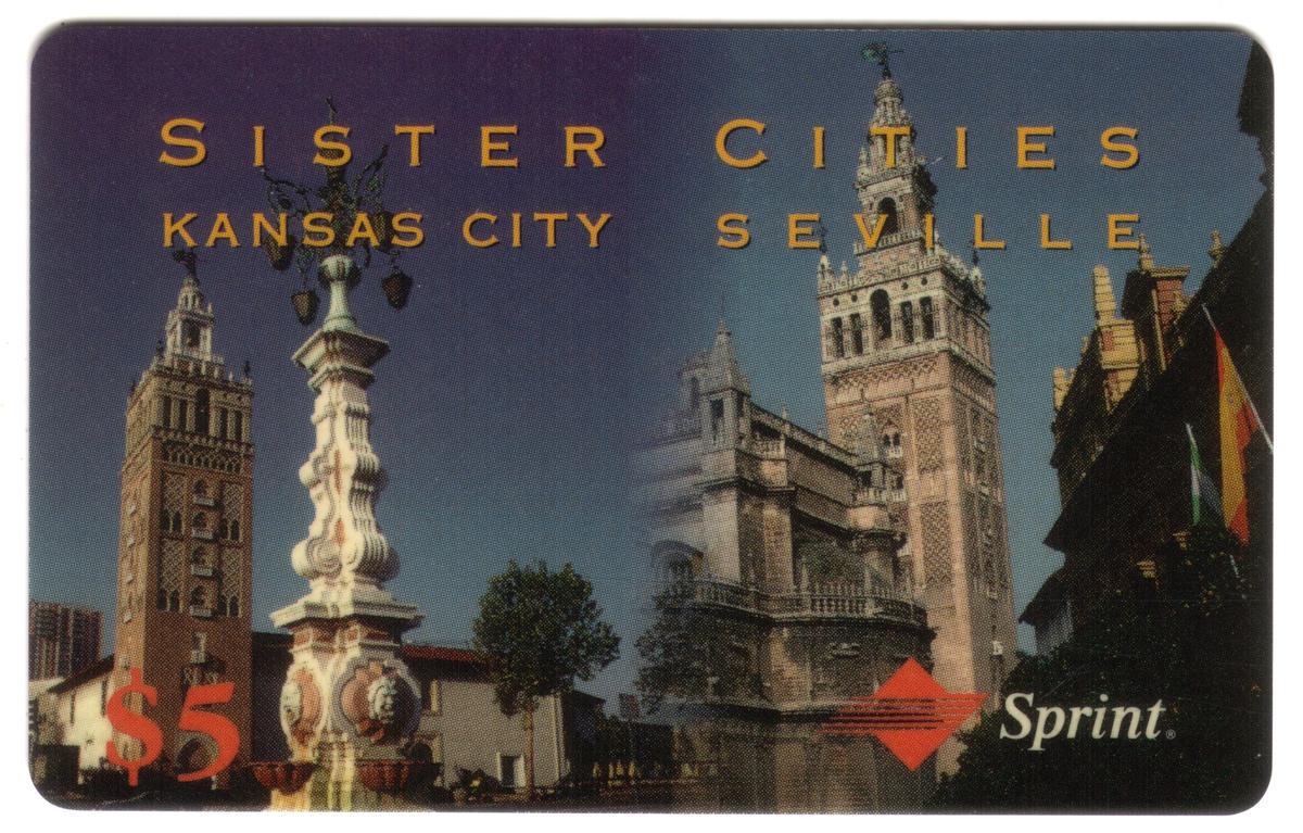 The card displays “SISTER CITIES” in uppercase gold letters at the top center, with “KANSAS CITY” on the left and “SEVILLE” on the right, emphasizing the international cultural connection. A $5 denomination is marked in bold orange near the bottom left corner. The Sprint logo, consisting of an orange diamond shape and the word “Sprint,” appears clearly at the bottom right of the card, confirming the telecommunication brand issuing the card.