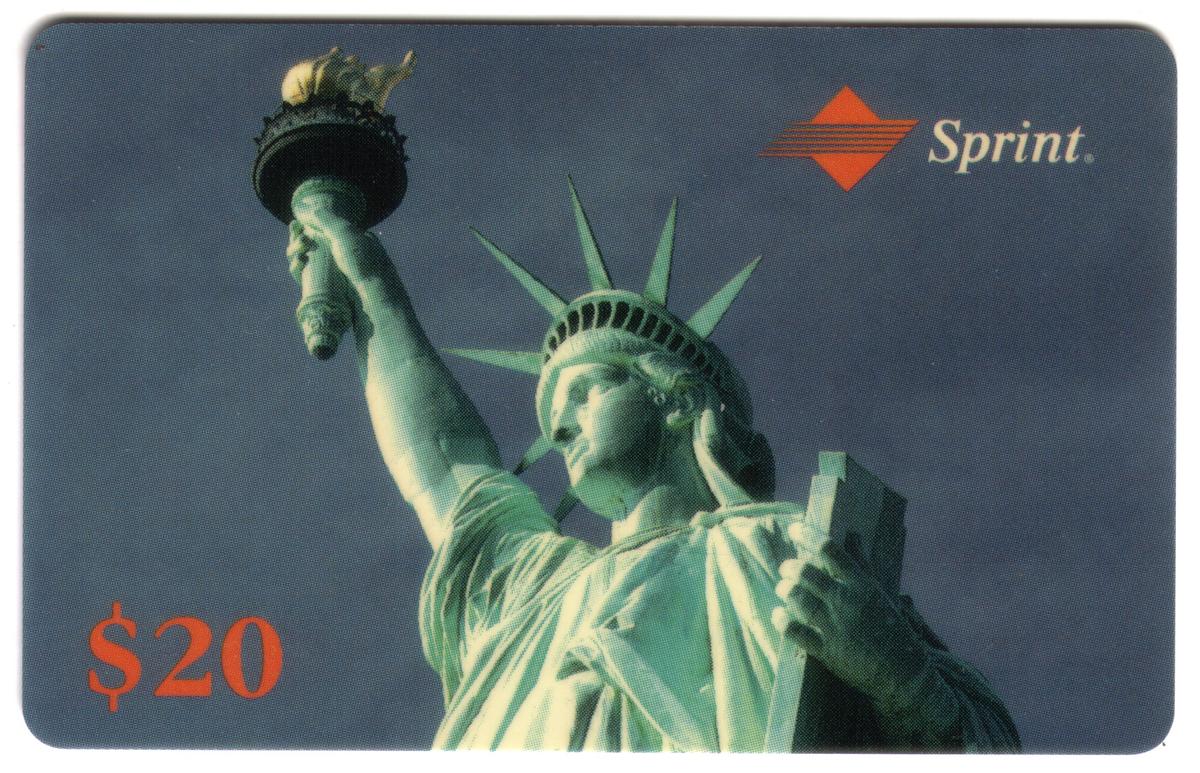 Text on the card includes "$20" in the upper left corner, indicating the card’s value. Below the statue, the wording "Statue of Liberty PROOF (Blank Reverse)" is printed, identifying the specific edition of this collectible card. The word "Sprint" appears in the lower right corner, indicating the telecommunications company associated with the card.