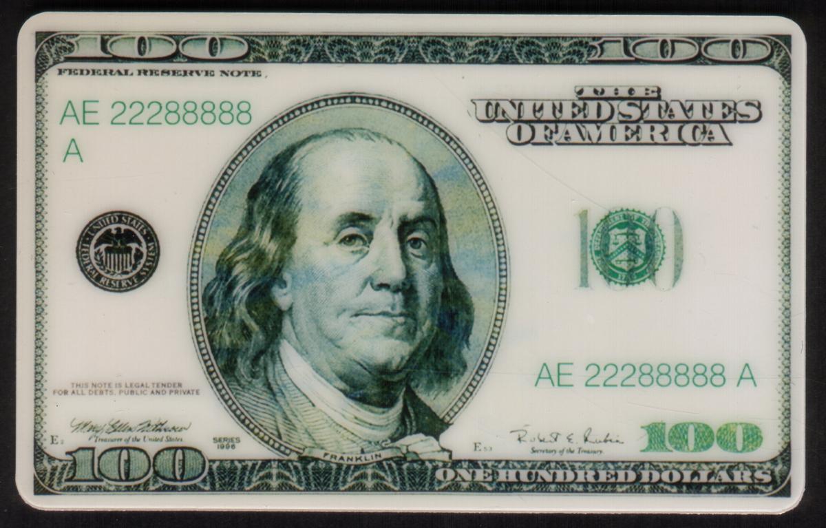 This collectible card features a detailed reproduction of the United States $100 bill prominently displaying the portrait of Benjamin Franklin centered on the front. The bill is marked with the serial number AE 22288888 A, repeated twice, once on the left and once on the right side of Franklin's portrait. The denomination "100" is shown in large green numerals in the bottom left and bottom right corners.