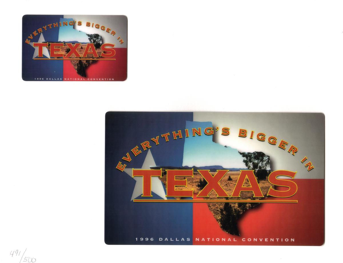 Printed on both cards is the "Zenex" brand name, linking them to the telecom company. The text "Strategic Telecom Systems" appears clearly, along with references to Texas and the year 1996. The phrase "Everything's Bigger in Texas" is featured, highlighting the celebratory theme of the collection. Both cards are presented in a folder that holds the regular and jumbo sizes side by side, emphasizing the unique Texas pride.
