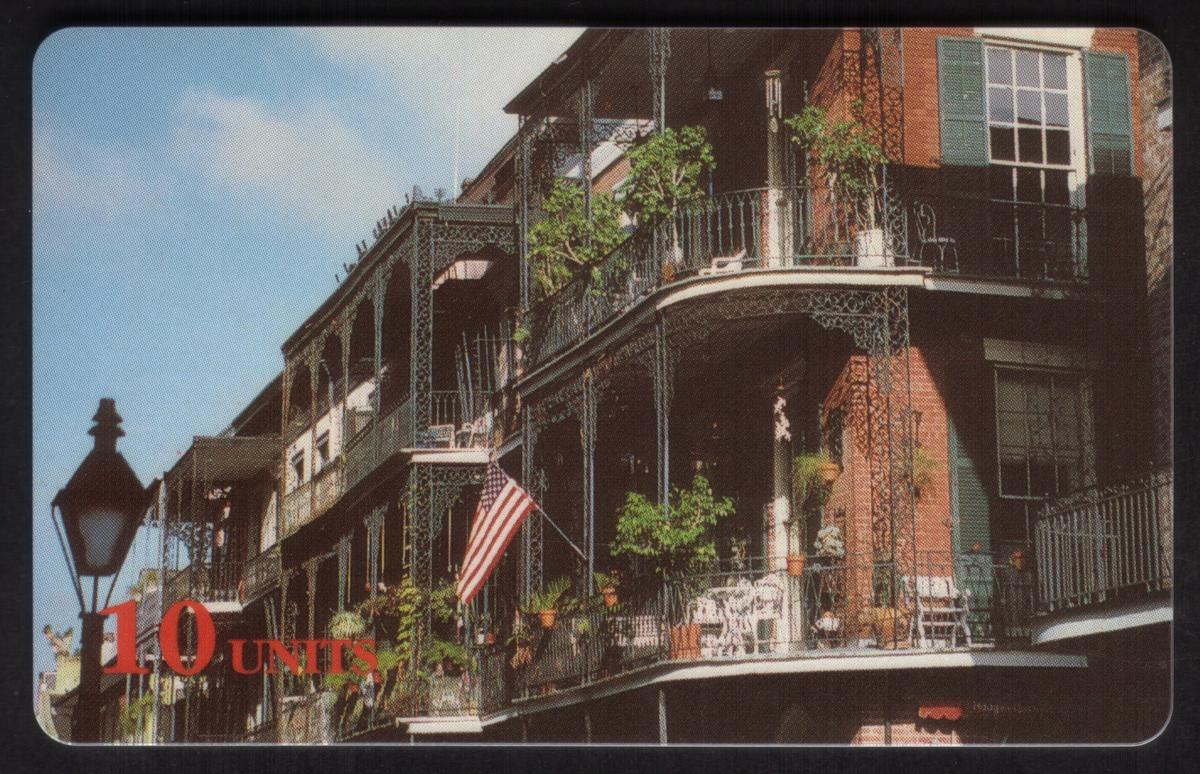 Printed in 1993, this phone card is linked to tourism and sightseeing in New Orleans, reflecting the city’s cultural aesthetics and architectural heritage. The text and imagery directly connect to American flags, architecture, lamp posts, house plants, and the specific locale of New Orleans, LA, Louisiana.