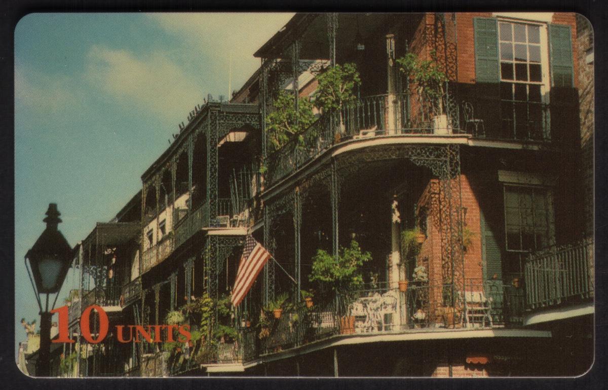 This collectible chip card prominently features a vibrant street scene from the French Quarter in New Orleans, Louisiana. The image captures distinctive architecture typical of the area, including classic wrought-iron balconies and colorful building facades. American flags hang from the buildings, adding a patriotic touch to the lively urban environment. Several traditional-style lamp posts line the street, contributing to the historic charm of the district.