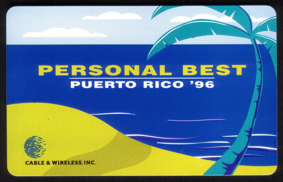 Prominently centered in bold yellow and white letters, the card reads "PERSONAL BEST PUERTO RICO '96," indicating its association with Puerto Rico and the year 1996. In the lower left corner, the logo and name "CABLE & WIRELESS, INC." appear in black text alongside a globe symbol made of segmented horizontal lines.