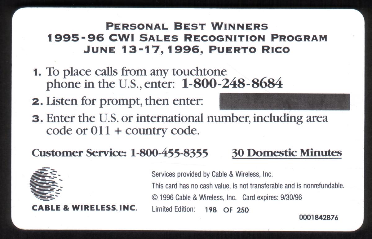 This phone card commemorates a Cable & Wireless (CWI) Sales Recognition event held in Puerto Rico in June 1996 and reflects the themes of travel, sightseeing, and American territories including Puerto Rico. The overall design is clean and bright, capturing the essence of a tropical US Commonwealth territory beach environment.