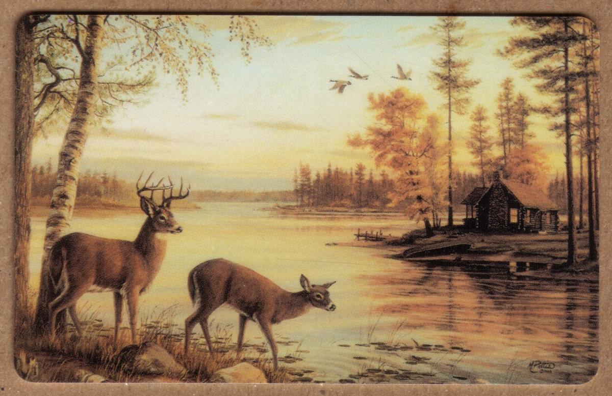 The first card depicts a serene lakeside scene during autumn. In the foreground, a buck with antlers and a doe are standing by the water’s edge. The calm lake reflects the sky and the autumnal trees on the far shore. To the right, a rustic log cabin sits near a dock extending into the water. Birds fly low over the lake, and tree branches frame the sky, adding depth to the composition. The warm color palette emphasizes the tranquil mood of this upper Midwest landscape.