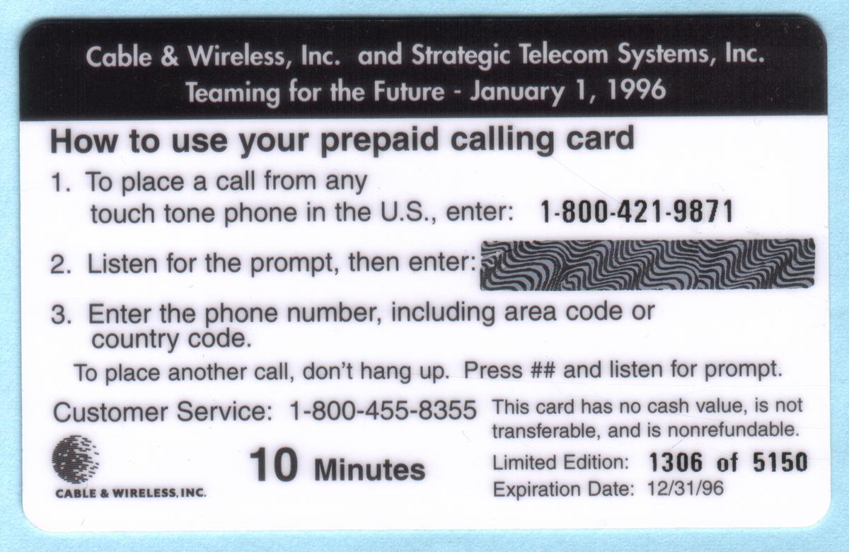 Since we have the world's largest inventory of USA phonecards for collectors, you will not necessarily receive the identical serial/batch/PIN number that we have scanned/pictured.
